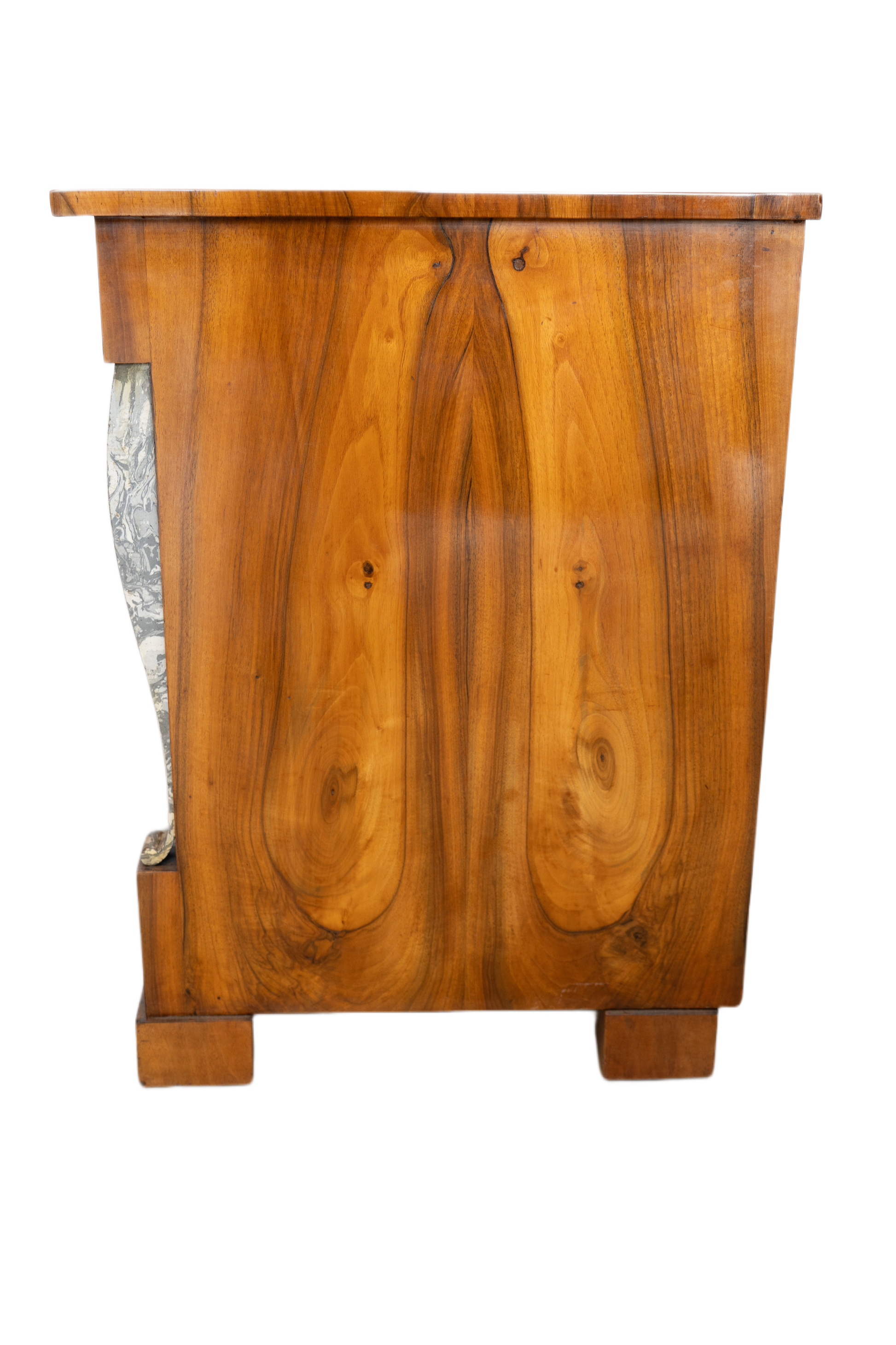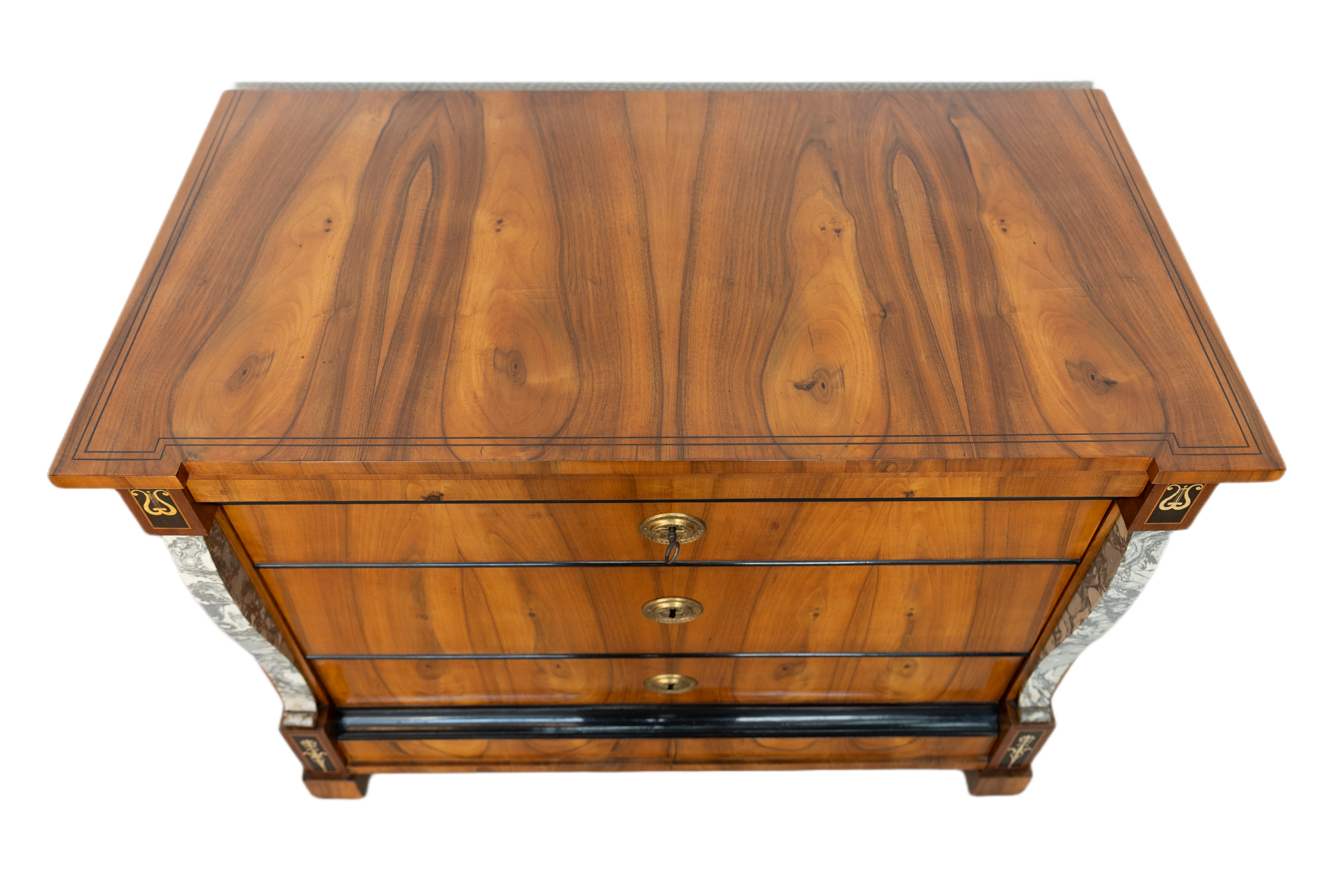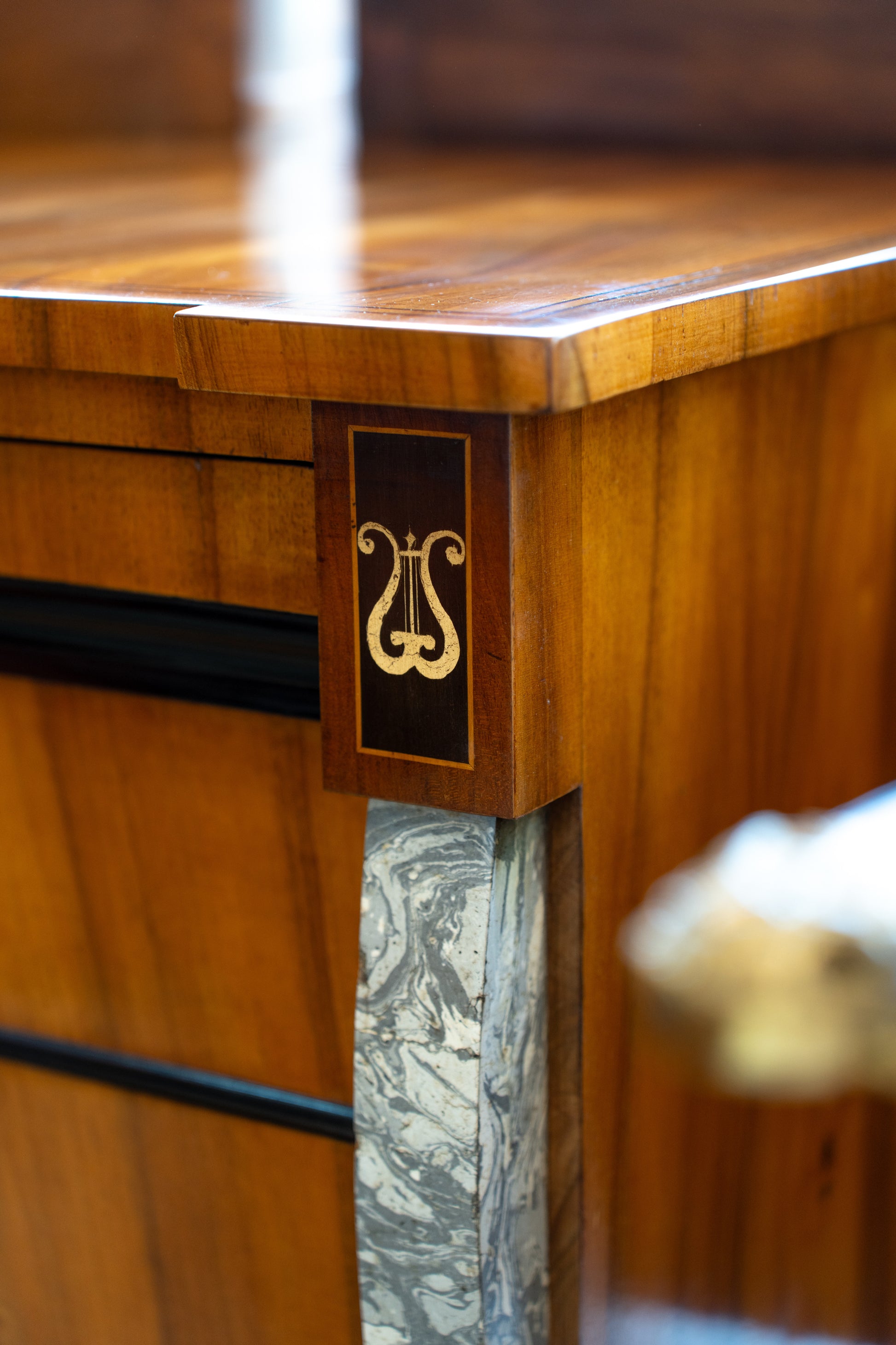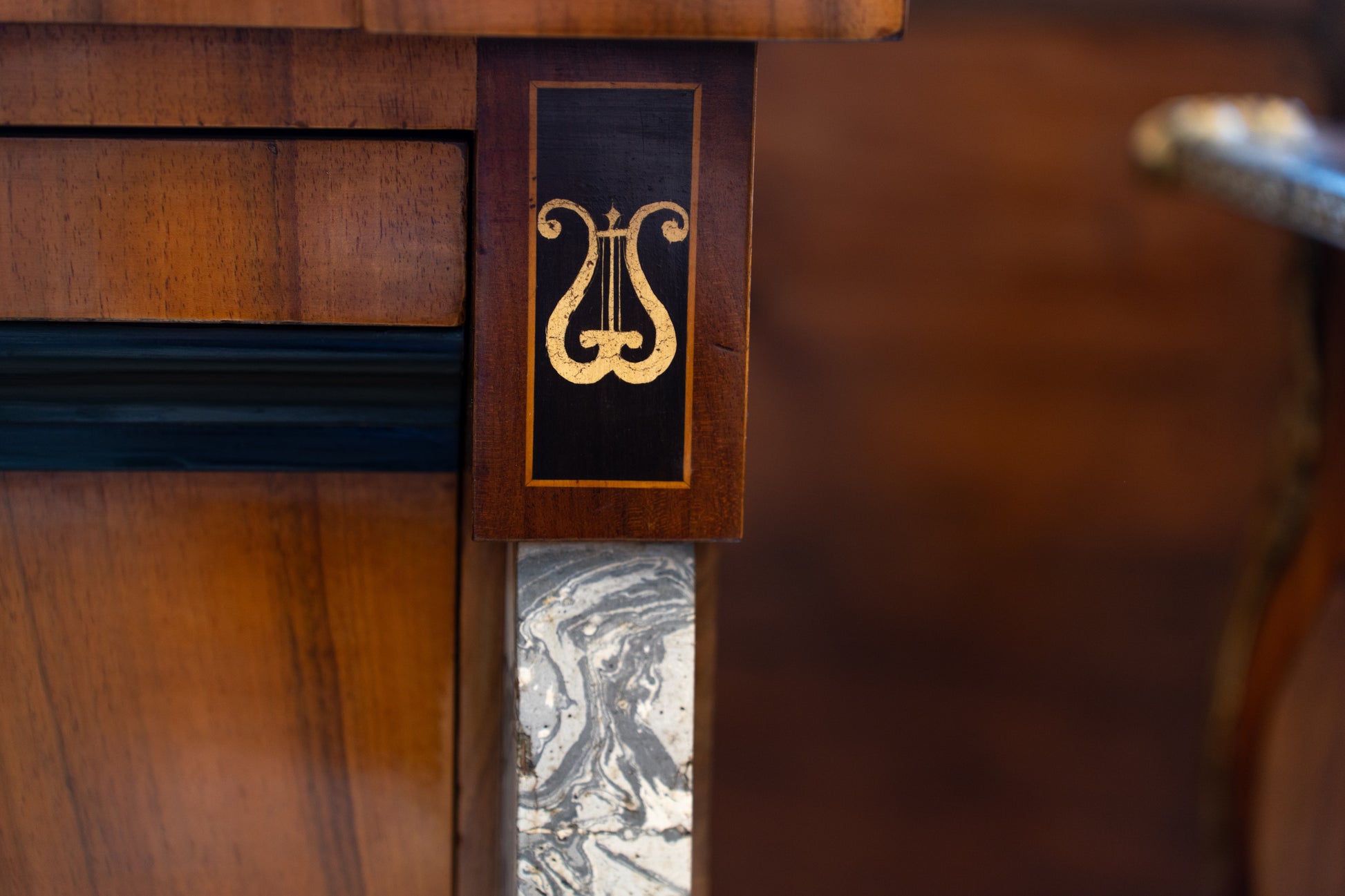 Nußbaum furniert, Bandintarsie auf der Deckplatte in Ebenholz, Messingbeschläge, weiß/graue Marmor-Pilaster, eingelegte Lyra über dem Kapitell, eingelegte Blume unter dem Kapitell.